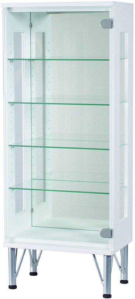 サイズW400 x D250 x H1000 mm 重量約21kg 材質(本体)MDF突板貼り (扉)4mm厚強化ガラス (棚)5mm厚ガラス (脚)スチール製 備考(耐荷重)1枚5kg・4枚 木目調のボディにマットに光るスチール脚。