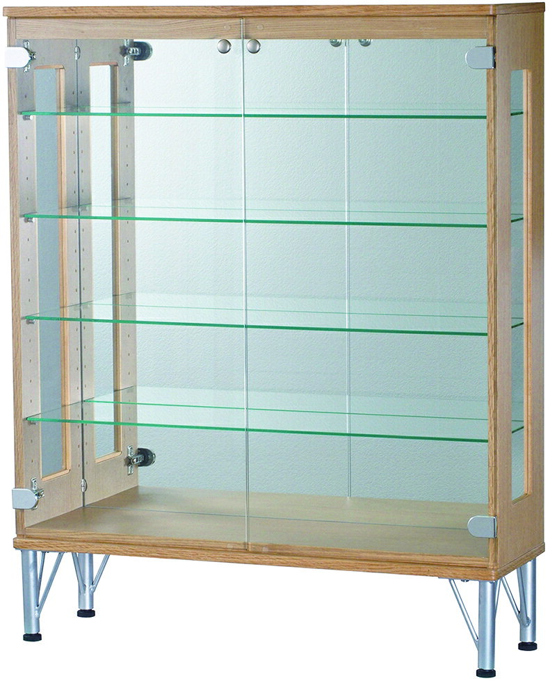 サイズW800 x D250 x H1000 mm 重量約35kg 材質(本体)MDF突板貼り (扉)4mm厚強化ガラス (棚)5mm厚ガラス (脚)スチール製 備考(耐荷重)1枚5kg・4枚 木目調のボディにマットに光るスチール脚。