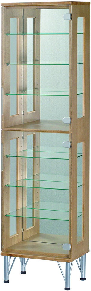 サイズW400 x D250 x H1500 mm 重量約30kg 材質(本体)MDF突板貼り (扉)4mm厚強化ガラス (棚)5mm厚ガラス (脚)スチール製 備考(耐荷重)1枚5kg・6枚 木目調のボディにマットに光るスチール脚。